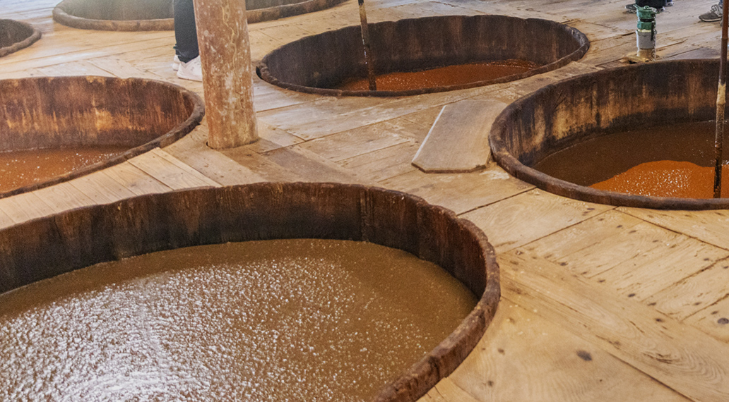 大正時代に作られた大きな樽の原材料はすべて天然素材。 製法を変えず、天然醸造の本醸造を作っています。伝統の技を守り続けて醤油づくりに取り組む醸造職人のこだわりの姿がそこにはあります。杉樽仕込みで2年半熟成・発酵させ、また大豆・塩・麦のみで仕込み、化学調味料を一切使用しない製法で製造しています。
