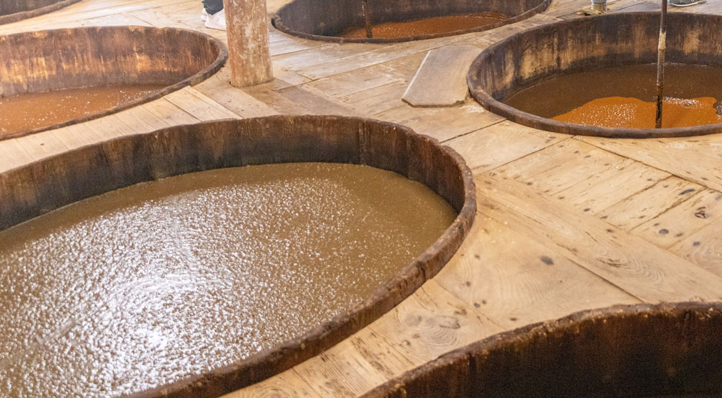 醤油を製造するとき諸味(もろみ)を発酵熟成させる醸造工程があります。一般では大量生産される製品には、この醸造工程を加温などにより短縮し、早いものでは3ヶ月間で製品化されています。北伊醤油で取り扱う「天然醸造しょうゆ」は、常温で2年から5年程の間じっくりと熟成させています。このことにより、醤油本来の深みある味わいと、高い香りが醸しだされます。